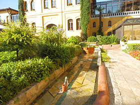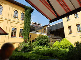 朝食をいただいた中庭の様子を少し。小鳥が飛んできて、パンを物色してます! ![]() 中庭は緑が豊かで、とても快適です。左の写真。モザイクに用いられているようなガラスのテッセラが噴水に使われていて、とてもきれいでした。 ![]()