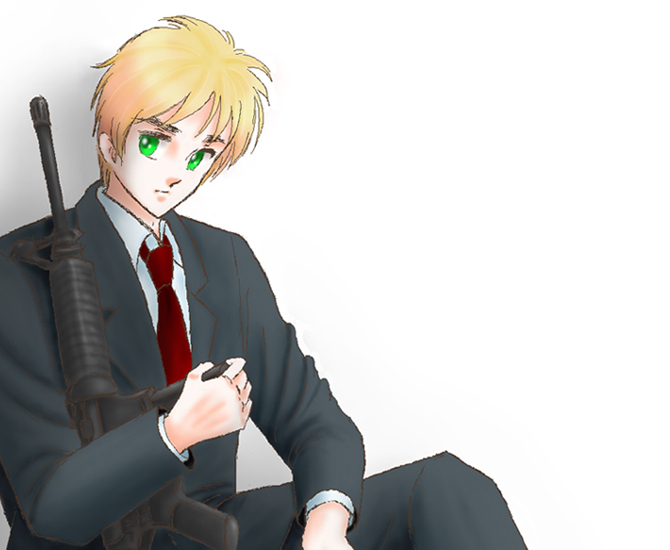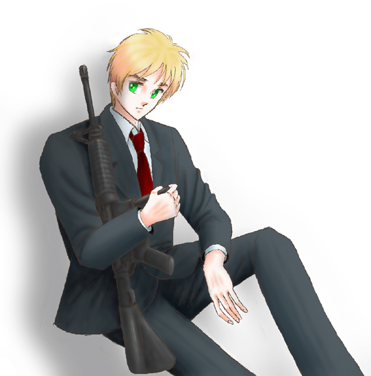 またまた描いてしまいました・・・もうビョーキかも(笑)。 描いたきっかけは・・・原作者さまのサイトで、どうも海外で売られているらしいTシャツの写真を見たこと。・・・そのイギリスくんがかっこよかったんですよ♪ 画像の解像度があまりよくなかったのですが、黒スーツでマシンガン持って座っている図で。で、そんなにかっこよくは描けないけど、何となく自分でも描いてみたいと思った訳です。 ・・・でも。ヘタリアのキャラって・・・作品中ではあまり、武器って持っていないんですよね! 戦争の表現は、大体当人同士の“ケンカ”のような感じでで表されてますから。 だから、武器を持たせるかどうかで、実はちょっと悩みました・・・。 でも。倫理的にはマズイ発言かもしれませんが、武器って、「かっこいい」んですよね。で、結局、描いてしまいました!