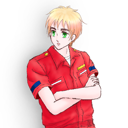来襲した宇宙人にコテンパンにやられた後のみんなのお衣装は、空軍とかの作業着??っぽいのですが、ここでもイギリスくんはキリッと赤いお洋服。 実際にはちょっと違うのでしょうが、イメージ的には、イギリス空軍のアクロバットチームである、“レッド アローズ”みたいな感じでしょうか・・・。 それで、壁に寄りかかって腕組みしてるところなんて、ほんと、ゼロナイのジェットを彷彿とさせるクールさ(笑)です!(ただしジェットはアメリカ人ですが・・・) ・・・で。そんなイギリス君を、模写とはいかないまでも・・・似せて描いたのがこの絵なんです。 でも・・・DVDおまけのフィルムのちっちゃな絵を見ながら、わざわざ苦手な方向で顔を描いたのに・・・DVD見直したら、逆だったんですよね・・・(涙)。 どうやらフィルムを裏から見ていたようです・・・。
